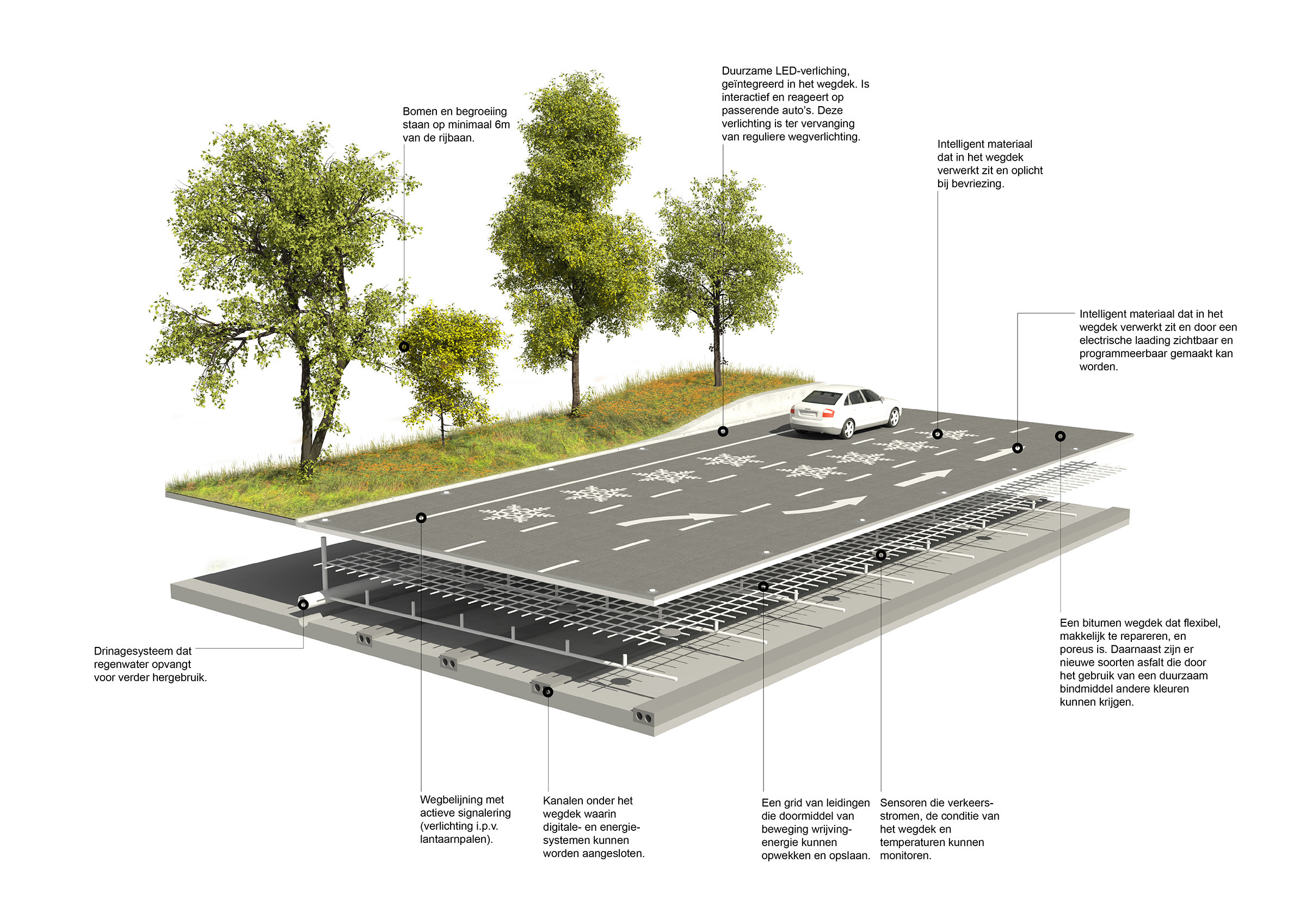 Het nieuwe snelwegtracé tussen de A13 en de A16 aan de noordzijde van Rotterdam wordt als een parkway ingebed in weide, natuur en recreatie. Het plan neemt afstand van de huidige praktijk waarbij door de veelheid en de ogenschijnlijke willekeur van alles wat zich langs en boven de snelweg bevindt, de ruimtelijke beleving van de weg in veel gevallen als rommelig, zielloos en nietszeggend wordt ervaren. Het overheidsbeleid heeft er toe geleid dat er zelden architecten worden ingeschakeld bij het ontwerpen van civiele bouwwerken waardoor ze weinig architectonisch-ruimtelijke samenhang vertonen. Bij de aanbesteding van civieltechnische werken wordt vooral gelet op de kosten en de technische uitvoering.